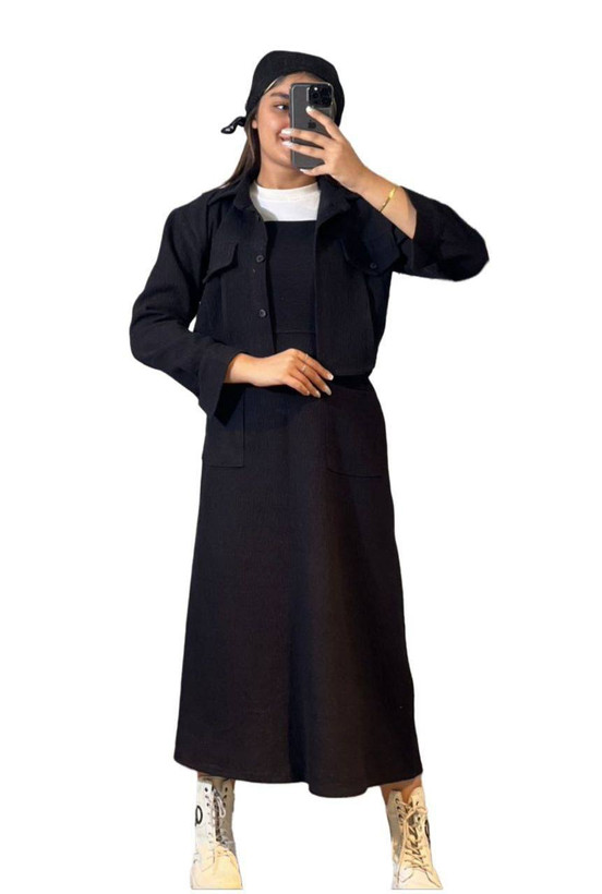 دامن پیش بندی و کت بیلر سوت مشکی 3 تیکه